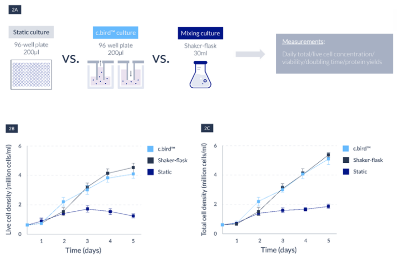 本實驗設計如圖 2A 所示。我們從 96 孔板(200 μL)到 30 mL搖瓶考察了 mAb CHO-K1 細胞系在兩種不同規模下的每日細胞生長/倍增時間/蛋白質產量,并在 96 孔板中比較了兩種不同的培養條件:標準靜態培養C.BIRD懸浮培養。我們的結果表明,采用懸浮培養的C.BIRD系統表現出優于靜態培養的優越性能,并且與搖瓶培養表現出相似的細胞系特征。