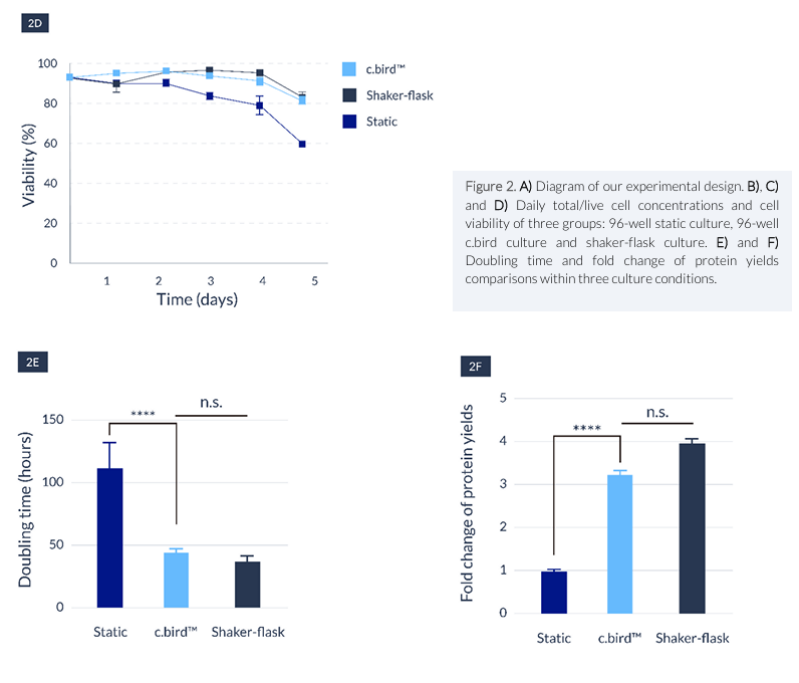 且與靜態培養相比,C.BIRD 培養法顯著縮短了細胞的倍增時間,從 114 小時縮短至 38.5 小時。在搖瓶培養(35.1 小時)和 C.BIRD 培養(38.5 小時)之間,細胞的分裂時間沒有顯著差異。結果表明,96 孔 C.BIRD 具有高性能水平,并且能夠在早期提供搖瓶生長條件(圖 2E)。