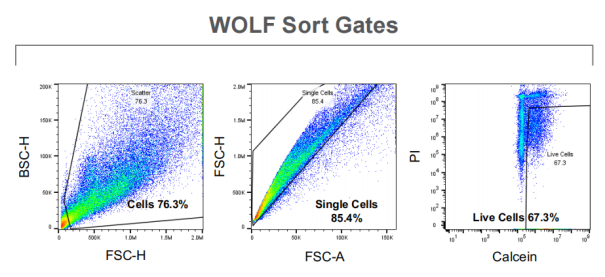 WOLF柔性單細胞分選儀是一種低壓微流體細胞分選儀(>2 psi),用于溫和地分選細胞,不會像傳統流式高壓噴嘴形成液滴,采用可拋棄式微流控芯片,進一步降低了生物危害,因此樣本和鞘液接觸到的一切都是無菌、一次性的,不會造成樣本間的污染。為了展示這種溫和的無菌細胞分選儀如何影響 10x 基因組學工作流程中的單細胞 RNA 轉錄組學,我們與一家大型癌癥中心的學術流式細胞儀核心合作,比較未分選的小鼠前列腺細胞與NanoCellect WOLF細胞分選儀和BectonDickenson FACSAriaTM II分選的細胞的樣本。
