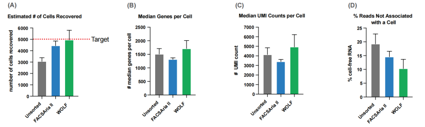 該實驗表明,使用BD FACSAria II或WOLF進行樣本制備,可減少碎片和死細胞對RNA的影響,從而獲得更高質量的scRNA測序結果。此外,這些數據還表明,使用細胞分選儀去除死細胞和碎片可提高細胞計數的準確性。