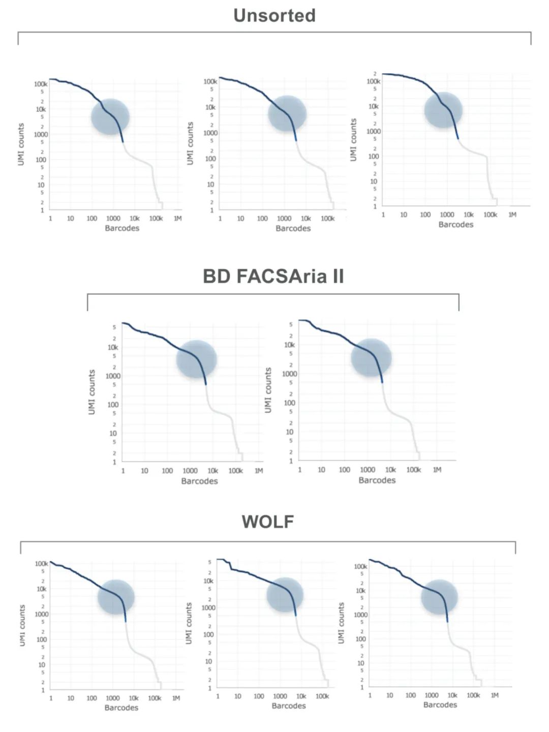 條形碼等級圖通過顯示 1)與細胞相關的條形碼;2)來自空分區的條形碼之間是否存在明顯的分隔,來幫助評估RNA的完整性。與活細胞相關的條形碼的UMI計數應大大高于無細胞或低質量細胞的背景條形碼。因此,在RNA質量較高的樣本中,UMI計數和條形碼之間會出現陡峭的斜坡或下降。下圖顯示了每個樣本的UMI與條形碼對比圖,與未分選的對照樣本相比,在BD FACSAria II和WOLF分選樣本中可以觀察到更陡峭的斜坡或彎頭(高亮圓圈)。這些結果表明,在10x Genomics工作流程的上游使用細胞分選儀可提高RNA質量,同時減少來自無細胞來源的污染RNA。WOLF分選樣本的UMI計數也更高,反映出細胞分選過程對細胞的損傷更小。