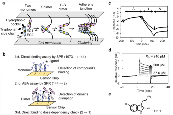 蛋白的組裝揭示了幾乎所有生物學過程:1. 已有大量被報道的各種功能復合物的同源或異源結構信息;2. 能夠對蛋白組裝進行調節的調節分子可以做為潛在的藥物或探針,用于進一步研究蛋白的功能。但小分子在調節蛋白-蛋白相互作用及組裝方面存在困難,部分原因如下:首先,蛋白互作通常會牽涉到較大的分子區域,但是,小分子可以進入的區域較小。除此之外,在蛋白-蛋白互作界面,通常不存在明顯的凹槽;缺少能夠指導配體分子設計的天然蛋白互作分子抑制劑存在。細胞通過鈣粘素蛋白家族,一類鈣依賴性的細胞黏附蛋白分子,發生細胞之間的黏附,蛋白的組裝。根據不同的生物組織環境,鈣粘素分子在各種組織的腫瘤發生中發揮作用。P-鈣粘素分子是一種經典的鈣粘蛋白,已發現在許多腫瘤組織中過表達,促進了腫瘤的轉移和增殖。細胞之間的聚集體形成,能夠阻止anoikis和P-鈣粘素蛋白介導的信號通路,這對于腫瘤細胞的存活至關重要。因此,P-鈣粘素蛋白功能的抑制已成為一種潛在的抗癌策略。細胞黏附可以通過不同的細胞間的鈣粘素蛋白反式同源二聚化實現,也可以通過相同細胞間的鈣粘素蛋白的順式聚集而成。對于一些類型I的經典的鈣粘素蛋白,包括P-鈣粘素,反式同源二聚化已經被廣泛的研究。蛋白五個結構域中的兩個細胞外結構域(EC12)經證實在蛋白互作的過程中發揮作用(請見Fig. 1a)。X二聚物,也被稱為鏈-插入二聚物(S-S dimer),是一種中間過渡狀態,能夠促進最終二聚體的形成。S-S二聚物具有一種特定的結合模式,在該結合模式之下,一個單體N末端的色氨酸殘基可以插入另一個單體的疏水口袋。根據這種模式設計的一些肽類分子模擬配體已有相關報道,但還未有相關的配體分子被鑒定,可能是由于這個疏水口袋在S-S二聚化狀態期間,一直被單體自身或另一個單體的色氨酸殘基所占據,進而影響了對相關分子機制的更進一步深入研究。在體外進行S-S二聚化過程的抑制研究也許不是最好的方法,我們需要考慮其他方式,研究小分子在調節細胞黏附分子組裝方面的功能。