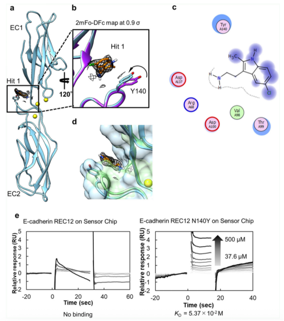 有趣的是,當我們將P-鈣粘素-Hit 1復合物結構與E-鈣粘素結構進行疊加時,我們發現E-鈣粘素的腔室體積小于P-鈣粘素的腔室體積。通過CASTp 30對P-鈣粘素,E-鈣粘素結構和P-鈣粘素單體-Hit 1復合物結構的腔室體積進行測量,也證明了這一點,分別是12.2 ? 3 , 5.4 ? 3 , 21.4 ? 3。該結果表明較之于E-鈣粘素,P-鈣粘素的腔室更適合于結合Hit 1分子。此外,FTPap分析得到的31個結合區域,都存在于P-鈣粘素中。SPR數據同樣表明,Hit 1不與E-鈣粘素結合,但是能夠與E-鈣粘素N140Y突變體結合(請見Fig. 2e)。因此,與Hit 1的結合腔室,能夠做為P-鈣粘素選擇性配體設計的起始點。