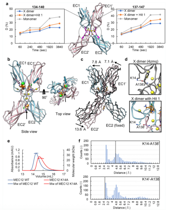 與X二聚物無輔因子的狀態相比,與Hit 1結合的X二聚物呈現出較顯著的結構變化。EC1-EC2結構域角度變得平滑,B鏈相對于A鏈發生了轉變(請見Fig. 3c)。該角度的結構變化推測可能是由于兩個Hit 1分子結合在Y140周圍的腔室引起。在 X 多聚體的界面處,K14 的側鏈與 A138 的主鏈之間形成的氫鍵(即在 Hit 1 結合時形成的那一個)被破壞了(請見Fig. 3d),可能導致了兩個單體分子的位置轉變。