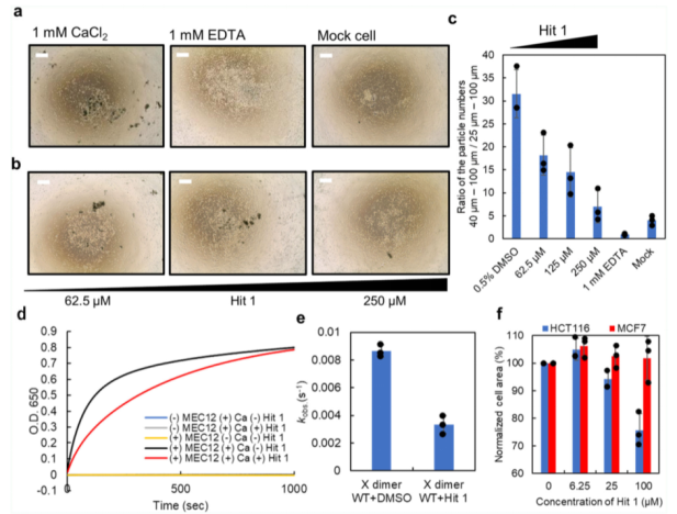 當同時添加Hit 1和1mM的CaCl 2分子時,聚集體的形成呈現Hit 1濃度依賴的方式(請見Fig. 4b, c)。而當Hit 1加入到已經形成聚集體的培養體系中時,在檢測時間段,形成的聚集體仍舊穩定存在,而EDTA能夠部分的破壞已經形成的聚集體。這些結果說明,Hit 1是通過阻止X二聚化形成過程中兩個單體分子的互作,一旦細胞聚集體形成,Hit 1是無法破壞它們的互作穩定性的。