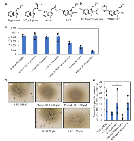 由于Hit 1以及初篩鑒定的許多化合物都包括陽離子功能基團,我們因此通過基于吲哚的商業化合物:tryptamine, tryptophan, 和 auxin 鑒定了陽離子功能基團對于結合活性的重要性(請見Fig. 5a)。令人驚訝的是,只有tryptophan與 P-鈣黏蛋白結合,這可能是由于Hit 1結合口袋周圍蛋白表面存在著負電荷。該結果表明,在進一步的藥物發現中,不應對陽離子基團進行修飾改造。根據Hit 1和P-鈣粘素蛋白的2D相互作用圖譜的研究(請見Fig. 2c),我們制定了兩個進一步合成的策略:(1)將吲哚環第二個位置的甲基替換成羧基,這將導致羧基和R68,氨基和D137之間形成鹽橋;(2)將吲哚環中 C5 位置的氯原子替換為一種更大分子量的官能團,抑制第二個單體的接近。我們首先合成了3-(2-氨基乙基)-5-苯基-1H-吲哚-2-羧酸(簡稱 Hit 1-羧酸,請見Fig. 5b),但是從SPR親和性檢測來看,它與REC12的親和性并不優于Hit 1,也不具備細胞聚集抑制效應。接下來,我們合成了 2-(2-甲基-5-苯基-1H-吲哚-3-基)乙烷-1-胺(苯基-Hit 1)(請見Fig. 5b)。通過SPR互作檢測分析,我們觀測到一種劑量依賴性應答;其與REC結合的親和性與Hit 1相同。在脂質體聚集檢測中,苯基-Hit 1相比較于Hit 1,具有更強的抑制活性。tryptamine, auxin 和 tryptophan對聚集效應影響較?。ㄕ堃奆ig. 5c)。Tryptamine 不具有大的功能基團,這可能是它不能抑制脂質體聚集的原因。在細胞聚集檢測中,苯基-Hit 1相較于Hit 1具有更強的抑制效應,且苯基-Hit 1與X二聚體的結合親和性要強于單體P-鈣粘素蛋白。