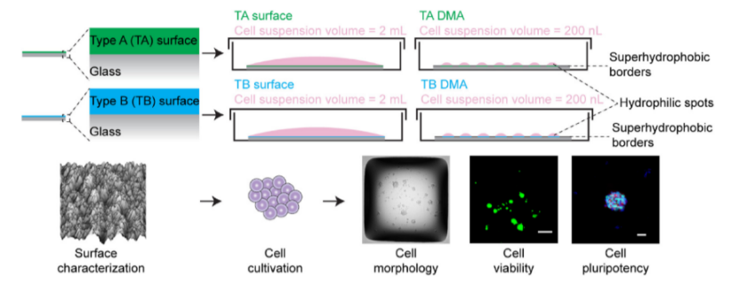 (A)本研究使用了兩種市售表面,A型(TA)和B型(TB)。“TA和TB表面”是指用于培養(yǎng)2mL體積的hiPSC的大面積(2.5cm×7.5cm)親水表面。“TA和TBDMA”是指含有分別具有TA和TB涂層的親水性斑點陣列的DMA。DMA平臺具有標準顯微鏡載玻片的尺寸,并且由在超疏水背景上的邊長為1mm的方形親水斑點陣列組成。在TA和TBDMA上以200nL體積培養(yǎng)細胞。(B)所執(zhí)行研究的工作流程。作為第一步,使用水接觸角(WCA)測角法、能量色散X射線光譜(EDX)、掃描電子顯微鏡(SEM)、原子力顯微鏡(AFM)和X射線光電子能譜(XPS)表征TA和TB表面。。作為第二步,在TA和TB表面上的2mL培養(yǎng)基中以及在TA和TBDMA上的200 nL培養(yǎng)基中培養(yǎng)hiPSCs。作為第三步,研究了在不同表面上培養(yǎng)的hiPSCs的形態(tài)、活力和多能性。