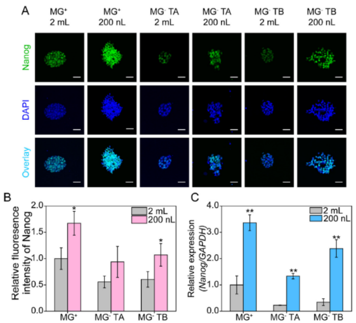 在不同條件下培養(yǎng)的細胞的hiPSC多能性的比較。(A)對在MGB1表面上培養(yǎng)的hiPSC的Nanog表達的免疫熒光(IF)染色(MGC10,2 mL細胞培養(yǎng)基),MGC10DMA(MG培養(yǎng)基,200nL細胞培養(yǎng)基),MGTA表面(MGTA,2 mL細胞培養(yǎng)基),MGTB表面(MGTB,2mL細胞培養(yǎng)基)、MGTADMA(MG-TA,200nL細胞培養(yǎng)基)、MGTBDMA(MG-TA,200 nL細胞培養(yǎng)基)。細胞核用DAPI(藍色)復染(n1/43個生物學重復)。比例尺:20 μm。(B)通過ImageJ測量每個實驗組的NanogIF染色的平均熒光強度。隨機選擇每個實驗組的三張圖像并進行分析。數(shù)據(jù)表示平均SD。*P<0.05,2 mL和200 nL組之間的顯著差異。(C)通過對從在不同表面和體積上培養(yǎng)的細胞分離的RNA進行qPCR分析來研究多能性特異性基因Nanog的表達(n/43個生物學重復)。將所有基因表達相對于參考基因GAPDH標準化,并表示為平均SEM。**P<0.01,2 mL和200 nL組之間的顯著差異。