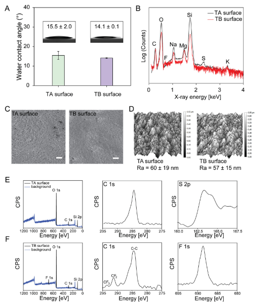 TA和TB表面的表征。(A)在環(huán)境條件(25℃)下,用8μL水滴測量親水性TA和TB表面的水接觸角(WCA)。數(shù)據(jù)代表平均SD(n?3)。(B)TA和TB表面的能量色散X射線光譜(EDX)。表面涂有碳以確保導電性。在TA表面上檢測到硫峰,在TB表面上檢測到氟峰。(C)利用掃描電子顯微鏡觀察了TA和TB的表面形貌,并對襯底不同位置上納米Si晶粒進行了統(tǒng)計。比例尺:2μm。(D)采用原子力顯微鏡(AFM)對樣品的表面形貌進行表征.表面粗糙度(Ra)由AFM高度輪廓(n?3)確定。(E)測量了TA表面的掃描X射線光電子能譜(XPS),以及TA表面C1s和S2p的XPS譜。(F)測量了TB表面的掃描XPS譜,以及TB表面上C1s和F1s的XPS譜。