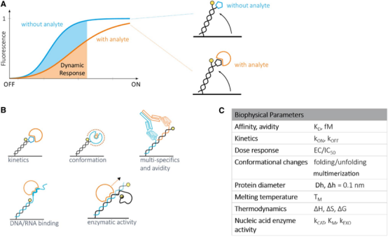 分子互作的結(jié)合動(dòng)力學(xué)可以在動(dòng)力模式或靜止模式下進(jìn)行。在動(dòng)力模式下,DNA納米桿可經(jīng)電場(chǎng)驅(qū)動(dòng)產(chǎn)生擺動(dòng),底物分子結(jié)合參數(shù)可經(jīng)DNA擺動(dòng)速率進(jìn)行測(cè)量(動(dòng)力應(yīng)答)。底物分子一旦與配體結(jié)合,DNA納米桿的動(dòng)力摩擦系數(shù)增加,其運(yùn)動(dòng)速率隨之降低(請(qǐng)見(jiàn)Fig. 1)。在擺動(dòng)速率上的變化,可用于評(píng)估動(dòng)力學(xué)變化及親和性參數(shù)(Kon,Koff,Kd)以及蛋白大小(Dh)或配體和復(fù)合物構(gòu)象變化。總的來(lái)說(shuō),動(dòng)力模式可以提供關(guān)于分子結(jié)合動(dòng)力學(xué),蛋白直徑,構(gòu)象改變,熱溶及熱力學(xué)變化,蛋白多聚等;在靜止模式下,DNA在穩(wěn)定的電場(chǎng)中,可保持直立狀態(tài),底物結(jié)合狀態(tài)可通過(guò)熒光距離接近感應(yīng)(FPS)的特性進(jìn)行檢測(cè)。熒光染料分子附近發(fā)生的結(jié)合事件將會(huì)改變?nèi)玖戏肿痈浇幕瘜W(xué)環(huán)境,導(dǎo)致熒光信號(hào)發(fā)生改變。靜止?fàn)顟B(tài)下信號(hào)的捕獲與底物分子的大小無(wú)關(guān),例如小分子結(jié)合動(dòng)力學(xué)檢測(cè)。靜止模式下,可以獲取結(jié)合動(dòng)力學(xué),熱溶和熱動(dòng)力學(xué)方面的信息,但是無(wú)法獲得蛋白直徑,構(gòu)象改變信息。此外,與動(dòng)力模式相比,靜止模式對(duì)于芯片的損耗較小,能夠延長(zhǎng)芯片的壽命。