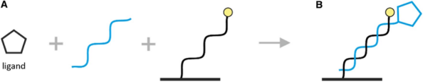 偶聯(lián)在芯片上的DNA,可以通過(guò)與攜帶有配體的互補(bǔ)DNA鏈進(jìn)行雜交,從而實(shí)現(xiàn)芯片的功能化。待測(cè)配體-DNA的偶聯(lián)可通過(guò)共價(jià)偶聯(lián)或芯片表面配體捕獲兩種方式實(shí)現(xiàn)。由于該芯片很容易進(jìn)行再生以及與配對(duì)鏈重新雜交,因此同一張芯片可以實(shí)現(xiàn)多種分子互作檢測(cè)的需求,這也是該技術(shù)可用于多種應(yīng)用的根本原因,比如蛋白-蛋白,蛋白-DNA/RNA互作,小分子結(jié)合篩選,親和性檢測(cè),構(gòu)象檢測(cè),核酸酶活性研究。