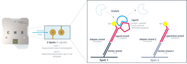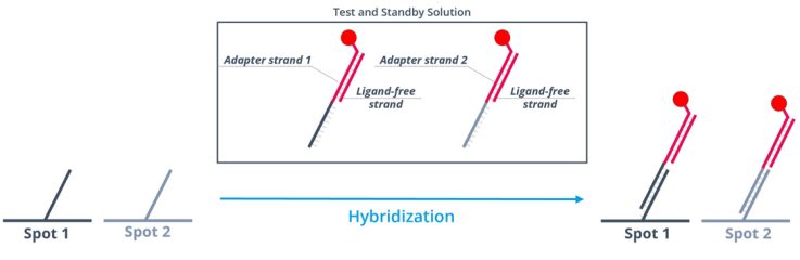 2. 適配體鏈可根據(jù)實(shí)驗(yàn)需求進(jìn)行定制,其范圍從標(biāo)準(zhǔn)的 96 個(gè)核苷酸序列或任何類型的 DNA 和/或 RNA 序列,到復(fù)雜的結(jié)構(gòu),例如用于研究大型分子復(fù)合物構(gòu)象變化的 DNA 折紙結(jié)構(gòu)或用于研究雙特異性分析物的超分子 DNA Y 結(jié)構(gòu)。適配體鏈的下半部分與芯片表面的錨定鏈互補(bǔ)——用于檢測(cè)點(diǎn)的適配體鏈1和用于檢測(cè)點(diǎn)2的適配體鏈2,從而實(shí)現(xiàn)芯片的功能化。在適配體鏈的3'端連接的熒光染料,從多種化學(xué)性質(zhì)各異的染料中選擇,能夠?qū)崿F(xiàn)信號(hào)檢測(cè)。標(biāo)準(zhǔn)的紅色和綠色染料(Ra 和 Ga)經(jīng)過(guò)優(yōu)化,適用于 switchSENSE® 測(cè)量,并且與大多數(shù)實(shí)驗(yàn)設(shè)置兼容,而另外四種染料(Rb、Rc、Gb 和 Gc)可用于根據(jù)不同的化學(xué)性質(zhì)優(yōu)化信號(hào)檢測(cè);
