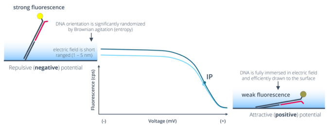 本文關(guān)于switchSENSE技術(shù)的SOP,其內(nèi)容包括整體SOP的一部分,涉及配體-DNA分子偶聯(lián)原理,芯片處理和操作建議,switchSENSE技術(shù)測(cè)量的模式。switchSENSE技術(shù)的核心為固定在微流控芯片上的DNA納米桿(一段短的DNA核苷酸序列)。芯片上的電極可以驅(qū)動(dòng)該攜帶有負(fù)電荷的DNA納米桿(“switched”),而通過(guò)交叉改變電壓,能夠使得DNA納米桿在電場(chǎng)中產(chǎn)生高頻率的擺動(dòng)。納米桿的運(yùn)動(dòng)軌跡可以通過(guò)電驅(qū)動(dòng)的時(shí)間相關(guān)的單光子計(jì)數(shù)器對(duì)DNA分子上連接的熒光探針信號(hào)檢測(cè)進(jìn)行實(shí)時(shí)的捕獲。記錄的熒光信號(hào)強(qiáng)度與DNA納米桿相對(duì)于芯片表面的位置相關(guān),因?yàn)闊晒馓结樢坏┙咏酒慕饘俦砻妫捎诎l(fā)生能量轉(zhuǎn)移,熒光信號(hào)會(huì)發(fā)生淬滅。
