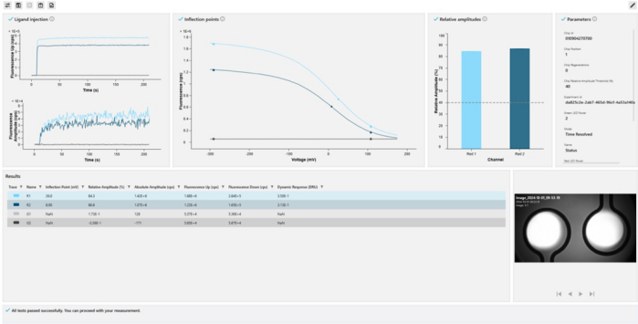 電壓校準(zhǔn)提供了關(guān)鍵信息,即有效驅(qū)動(dòng) DNA 納米杠桿所需的最敏感電壓切換范圍。這是通過(guò)施加不同的電壓并在每個(gè)步驟記錄熒光信號(hào)來(lái)實(shí)現(xiàn)的。在足夠負(fù)的電壓下,帶負(fù)電荷的 DNA 納米杠桿完全從表面排斥。隨著電壓向更正值轉(zhuǎn)變,觀察到S型信號(hào)下降,這反映了 DNA 納米杠桿逐漸接近淬滅的金表面。此過(guò)程的關(guān)鍵讀數(shù)是DNA納米杠桿向下運(yùn)動(dòng)的拐點(diǎn)(見(jiàn)下圖IP),該拐點(diǎn)用于選擇后續(xù)動(dòng)態(tài)響應(yīng)測(cè)量的最佳電壓范圍。在對(duì)功能適配器芯片進(jìn)行測(cè)試時(shí),軟件會(huì)在兩個(gè)紅色通道(R1 和 R2)中識(shí)別拐點(diǎn)。拐點(diǎn)應(yīng)在 -50 mV 至 400 mV 的范圍內(nèi)。如果未檢測(cè)到拐點(diǎn),軟件將直接從分析中提供故障排除選項(xiàng)以幫助解決問(wèn)題。