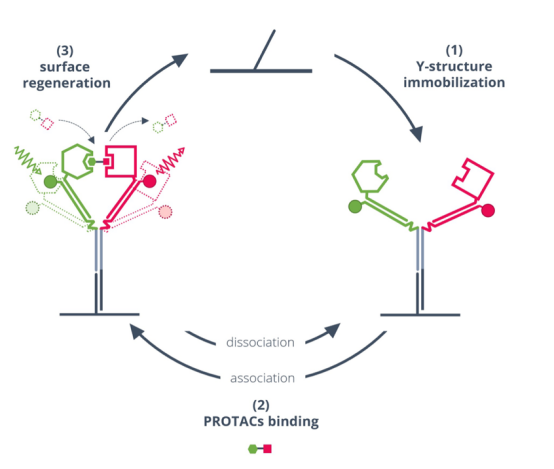 由于該技術(shù)基于操控性強(qiáng)的核酸鏈,并具備雙色檢測(cè)系統(tǒng),因此可用于三元復(fù)合物互作檢測(cè),比如PROTAC分子,雙特異性抗體操作,請(qǐng)見(jiàn)以下示意圖: