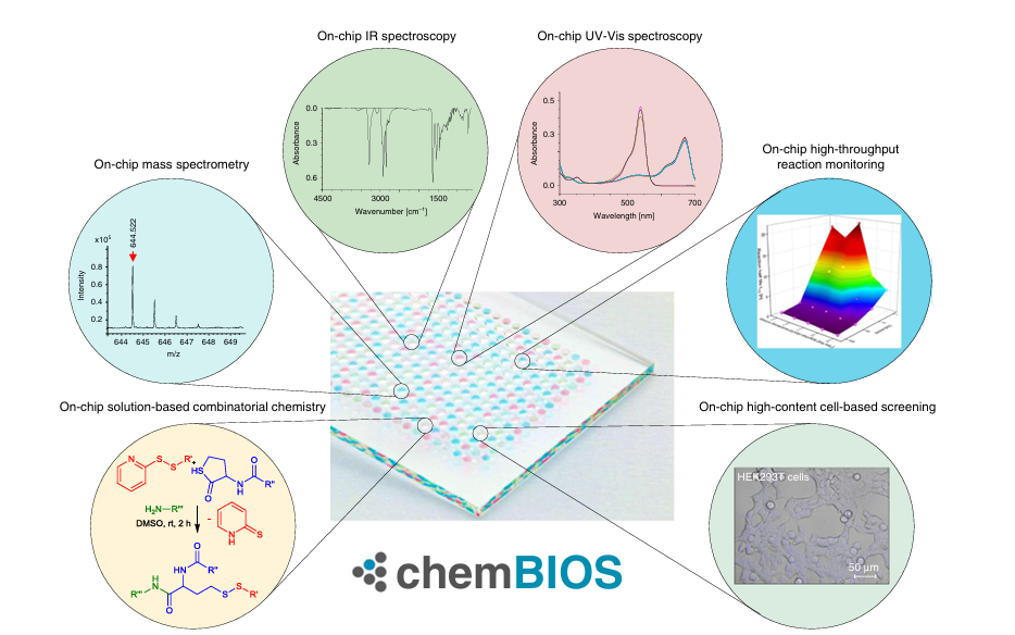 圖1 與 chemBIOS 平臺兼容的化學(xué)、分析及生物高通量方法。chemBIOS 能實現(xiàn)基于芯片的溶液合成,以及使用各種光譜和光譜學(xué)方法在芯片上進行分析表征,用于高內(nèi)涵篩選,同時還通過納米滴陣列將化學(xué)與生物高通量篩選統(tǒng)一起來。