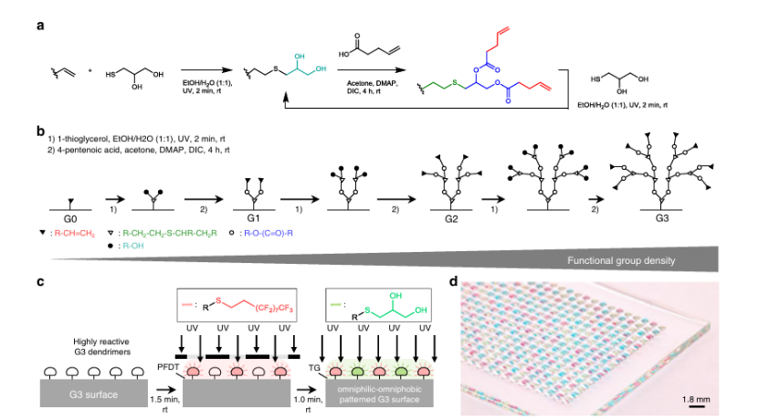 為了制備具有高和低表面張力液體的液滴陣列,疏水/疏油性圖案應(yīng)具有較大的前接觸角,而親水/親油性部分則應(yīng)具有極低的后接觸角。我們假設(shè),通過在高密度功能基團作用下對樹狀分子表面進行改性,可以增強潤濕性特性的對比度,從而形成一種全親水-全疏水的圖案。樹狀分子表面改性基于 Killops 等人開發(fā)的高密度功能基團聚硫醚樹狀分子合成方法(圖 2a)。將標(biāo)準(zhǔn)玻璃片用三乙氧基乙烯基硅烷進行硅烷化處理,以生成具有活性的乙烯基基團的表面。然后在重復(fù)的兩步反應(yīng)循環(huán)中合成樹狀分子層,該循環(huán)包括與 1-硫甘油反應(yīng)的光化學(xué)硫烯點擊反應(yīng),隨后與 4-戊烯酸酯化(圖 2b);三個循環(huán)可生成裝飾有高密度烯基的樹狀化表面。然后,該表面可以通過光化學(xué)方式分別與 1-硫甘油或 1H,1H,2H,2H-四氫呋喃酸進行功能化。利用洛羅德-辛卡硫醇(PFDT)可分別制得親水性或疏水性的表面。通過使用石英光掩模依次進行功能化處理,可以制備出具有特定幾何形狀的全親水或全疏水的微圖案(圖 2c)。