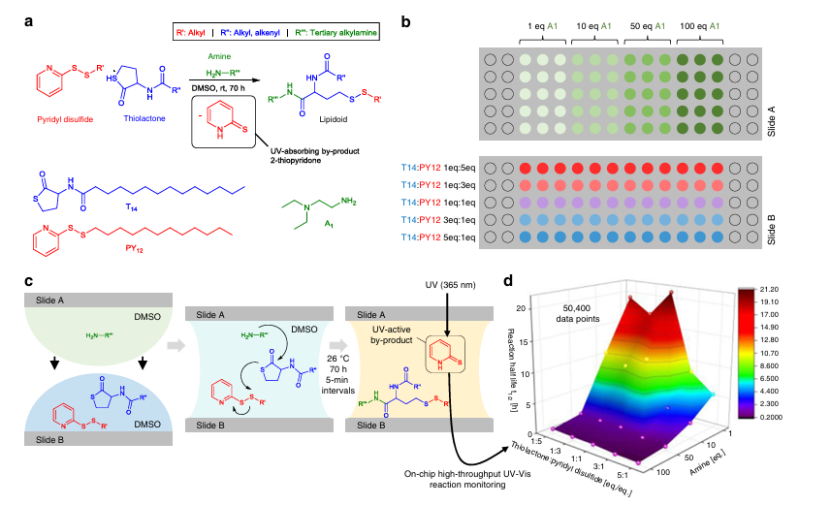 圖 4 芯片內(nèi)高通量反應(yīng)監(jiān)測。a 基于胺 A1、硫酯酮 T14 和吡啶二硫化物 PY12 的三組分脂質(zhì)體合成反應(yīng)方案。b 平行芯片內(nèi)六十種脂質(zhì)體合成的陣列布局。胺 A1 以不同濃度逐列分裝在載玻片 A 上。含有不同比例硫酯酮 T14 與吡啶二硫化物 PY12 的混合物逐行分裝在載玻片 B 上。所有反應(yīng)均通過將兩塊載玻片重疊夾合的方式同時啟動。c 重疊過程的示意性可視化以及由此產(chǎn)生的芯片內(nèi)基于溶液的反應(yīng)。最終的譯文:這個具有紫外線吸收特性的副產(chǎn)物 2-噻吩酮能夠通過紫外-可見光譜技術(shù)實現(xiàn)芯片內(nèi)原位反應(yīng)監(jiān)測。通過三維繪圖展示各反應(yīng)條件下的反應(yīng)半衰期(t1/2),展示了這種高通量系統(tǒng)在研究反應(yīng)參數(shù)和反應(yīng)機理方面所具有的強大能力。原始數(shù)據(jù)以“源數(shù)據(jù)文件”形式提供。