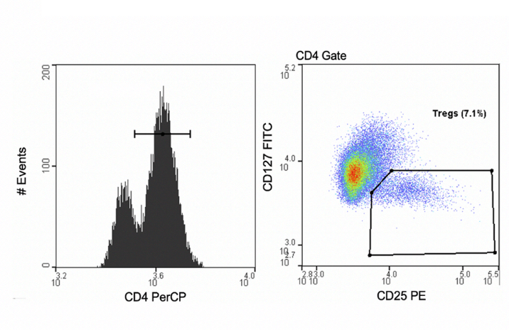使用密度梯度從血液中分離PBMC。然后使用人CD4+T細(xì)胞分離試劑盒(Akadeum)富集CD4+T細(xì)胞群。富集后,用WOLF細(xì)胞分選儀B進(jìn)行Treg分選。下圖為WOLF 上的Tregs分選門。