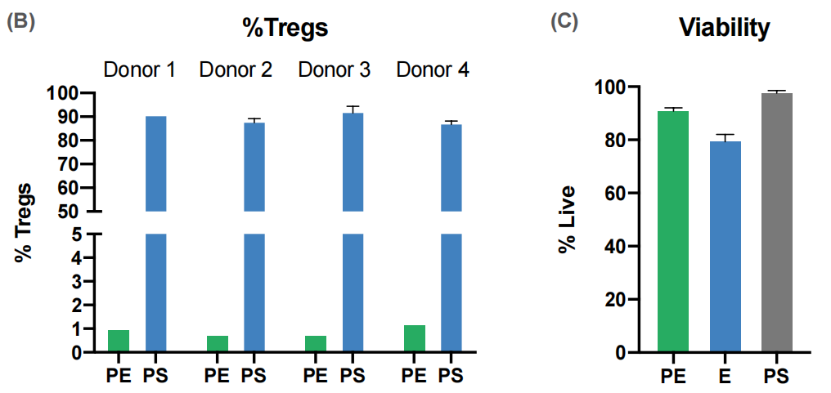 由下方左圖結(jié)果可以看出,淋巴細(xì)胞群內(nèi)的Tregs平均從1%富集至85-94%。并且在分選中通過結(jié)合散射和熒光活力染料鑒定活細(xì)胞來消除死細(xì)胞,富集前,平均91%的細(xì)胞群是活細(xì)胞,富集CD4+T細(xì)胞群后,活細(xì)胞百分比略有下降(80%),然而,在使用WOLF微流控柔性分選儀將死細(xì)胞和碎片排除后后,幾乎所有(98%)分選的細(xì)胞都是活的(下圖右)