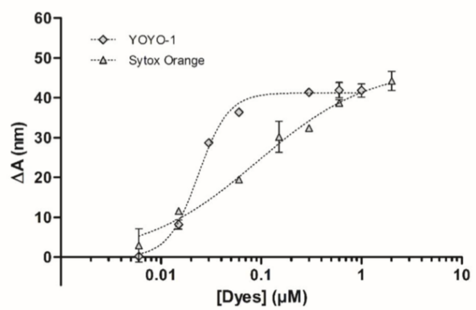 我們測量了顆粒在1xTE緩沖液中的運(yùn)動幅度,染料濃度范圍從nM到μM,發(fā)現(xiàn)顆粒的運(yùn)動幅度隨YOYO-1和SYTOX橙濃度變化的差異(請見Fig 2)