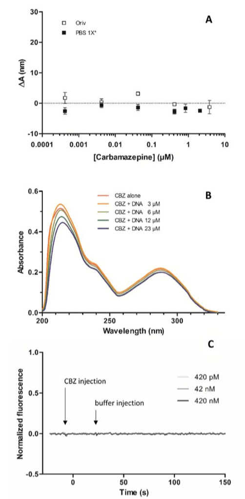 卡馬西平是廣泛使用的抗驚厥藥物,屬于最常出現(xiàn)在地表水中的殘留化合物分之一,其出現(xiàn)頻率之高甚至被認(rèn)為可以作為水生環(huán)境的人為污染標(biāo)志物。盡管其已經(jīng)證實(shí)具有慢性的基因毒性,但是其與DNA相互作用機(jī)制報道仍舊較少。如Fig 4A顯示,在合成水和 1X PBS中,隨著卡馬西平濃度從 0uM升至4uM,跨越40個濃度梯度,均未觀察到A值的變化。考慮到卡馬西平在水中較低的溶解度,我們利用HPLC測量了藥物的濃度。我們首先重復(fù)了已報道的所進(jìn)行的吸光度測量,通過記錄在 1X PBS 緩沖液中加入逐漸提高濃度的含有ctDNA 的卡馬西平溶液的紫外-可見吸光度譜,并將緩沖液的吸光度譜作為參考(請見Fig 4B)。結(jié)果顯示,吸收光譜并未出現(xiàn)任何變化,尤其沒有出現(xiàn)因離子嵌入而產(chǎn)生的藍(lán)色位移特征。其次,我們采用了最新的 Switchsense 技術(shù)進(jìn)行重復(fù)檢測,同樣并未觀測到卡馬西平與DNA相互作用的發(fā)生(請見Fig 4C).