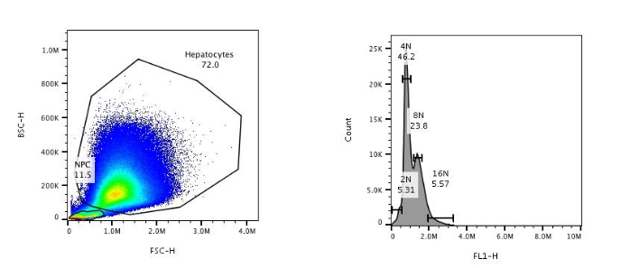 根據(jù)倍體對(duì)肝細(xì)胞進(jìn)行分類(lèi):首先根據(jù)其較低的FSC和BSC,將NPCs(異質(zhì)性非實(shí)質(zhì)細(xì)胞)排除在肝細(xì)胞門(mén)之外(下圖左)。每個(gè)Vybrant DyeCycle綠色峰表示基于DNA含量具有不同倍性的群體,根據(jù)不同的熒光強(qiáng)度對(duì)4N和8N峰進(jìn)行分選,以評(píng)估兩種倍體細(xì)胞生長(zhǎng)和類(lèi)器官形成的差異。
