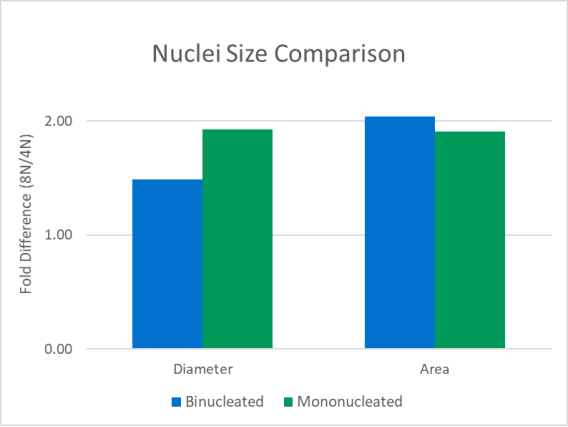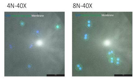 通過(guò)細(xì)胞成像并將8N核大小與4N核大小進(jìn)行比較來(lái)驗(yàn)證WOLF分選的準(zhǔn)確性。首先用DAPI對(duì)細(xì)胞進(jìn)行染色,并在40倍下成像,以確定核直徑和面積。分選后倍體顯示,8N肝細(xì)胞核的直徑和面積通常比4N肝細(xì)胞核大兩倍。這證實(shí)了WOLF正確地分選和分離了4N和8N細(xì)胞。