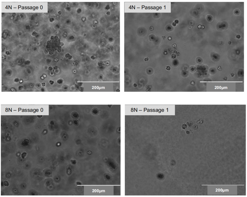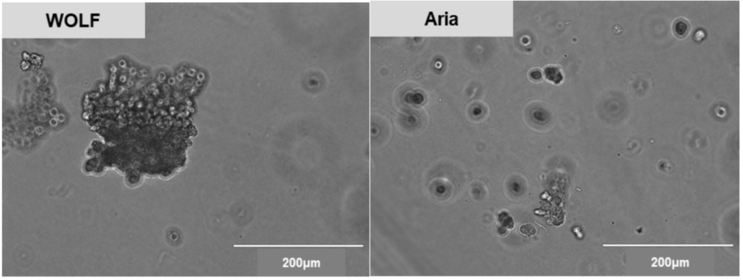 在傳代0中,在BD FACSAria II上分選的細(xì)胞沒(méi)有形成類(lèi)器官,這可能是由于從惡劣的分選條件中分選的細(xì)胞受到了傷害(下圖)。但在WOLF上分選的細(xì)胞長(zhǎng)成了類(lèi)器官,其形態(tài)與之前實(shí)驗(yàn)中分選前的肝細(xì)胞類(lèi)器官相似。由于WOLF產(chǎn)生了預(yù)期的形態(tài)并且沒(méi)有污染,因此它被用于進(jìn)一步評(píng)估倍性對(duì)增殖的影響。