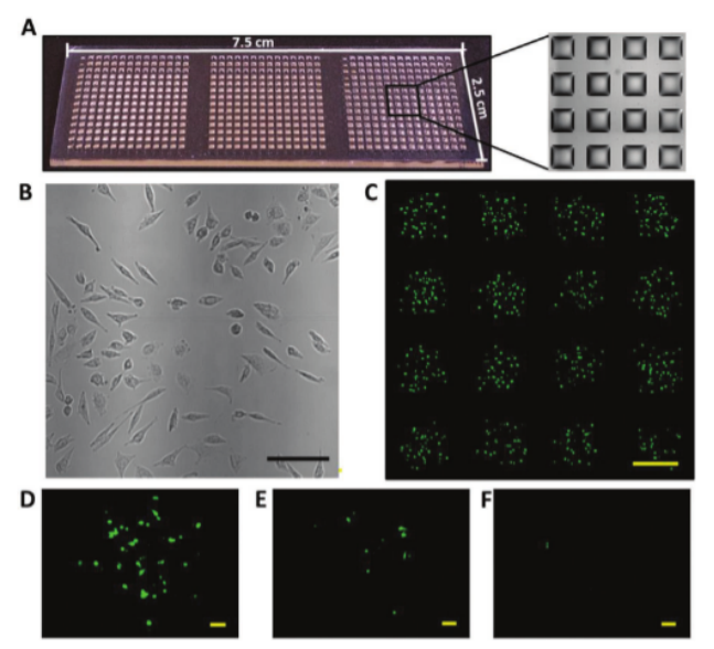 圖1. A)具有588個單獨微滴的1 mm(正方形邊長為1 mm)微滴微陣列(DMA)的代表性圖像。DMA載玻片的尺寸為7.5 ± 2.5 cm。B)明視野顯微鏡圖像,顯示孵育24小時后CHO-K1細胞的形態(比例尺:100 μm)。C)用GFP質粒DNA轉染的HEK 293 T細胞在具有Imm斑點尺寸的液滴微陣列上的代表性圖像(比例尺:Imm)。用GFP質粒DNA轉染的D)HEK 293 T細胞、E)CHO-K1細胞和F)Jurkat懸浮細胞的單個微滴的熒光顯微鏡圖像(比例尺:100 μm)。