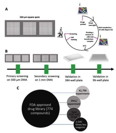 圖2. 原代細胞篩選的工作流程。A)將774種FDA批準的藥物作為DMSO溶液印刷在500 μmDMA載玻片上,并在真空干燥器中干燥過夜。然后將與轉染混合物(ScreenFectA轉染試劑,GFP質粒DNA)混合的細胞印刷到每個斑點中,并與藥物孵育24小時,然后固定和熒光顯微鏡分析。藥物的最終濃度分別為1、10和30×10?6m。將初篩的14種命中化合物打印到1mm DMA載玻片上,并以相同的方式重復該過程,除了使用更大的濃度范圍:1、5、10、20、30和40×10?6m。對于無藥物對照實驗,將轉染混合物打印到空點中。B)設計用于轉染增強劑篩選的高通量篩選方法。在500 μmDMA載玻片(每次實驗20 nL)上進行初步篩選,在1mm DMA載玻片(每次實驗100 nL)上進行二次篩選。在常規高通量篩選平臺384孔板中進行進一步驗證和比較。最后,在優化條件下在96孔板中確認命中。C)篩選了774種FDA批準的藥物,共進行了41796次單獨實驗。各個水性隔室的體積為20 nL,其總共產生僅0.84 mL的總細胞懸浮液,并且僅需要200皮摩爾的藥物(總共0.02摩爾),這比必須在384孔板中進行相同實驗的情況小2500倍。