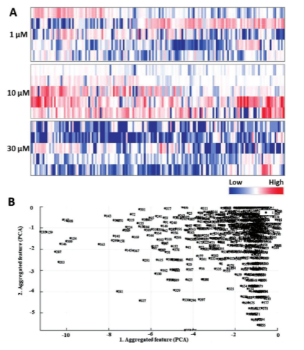 圖3. FDA批準的藥物對CHO-K1細胞轉染效率的影響。A)使用來自20898次總轉染實驗(三次生物重復和每次三次重復)的量化的相對轉染效率數據產生的熱圖。藍色和紅色分別表示與不添加藥物的對照相比,效率的降低或增加。使用了三種不同的藥物濃度:1、10和30×10?6m。B)使用主成分分析(PCA)評分圖的初步篩選結果的概述。每個數字代表FDA批準的藥物庫中的一種藥物。