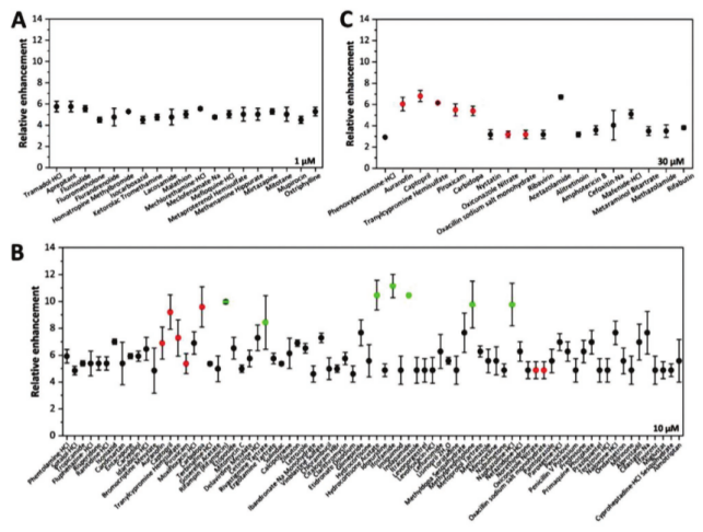 圖4. 在CHO-K1細胞的初步篩選中鑒定為轉染增強劑的命中化合物。A)774種FDA批準的藥物中的19種是從1×10-6 μM濃度的CHO-K1細胞的初步篩選中獲得的。B)在10×10?6m濃度下鑒定出78種命中化合物。C)在30×10-6 μmCHO-K1細胞處初步篩選獲得的18種命中化合物的散點圖。紅色表示化合物(金諾芬、卡托普利、半硫酸反苯環丙胺、吡羅昔康、卡比多巴、苯唑西林鈉鹽一水合物和硝酸奧昔康唑)在不同濃度下顯示可重復的正增強作用,綠色表示化合物(利福平、酒石酸卡巴拉汀、醋酸氫化可的松、異環磷酰胺、吲達帕胺、甲潑尼龍和鹽酸萘唑啉)在一個濃度下顯示強增強作用。數據表示為三次生物學實驗的平均值±SD,每次三次技術重復。