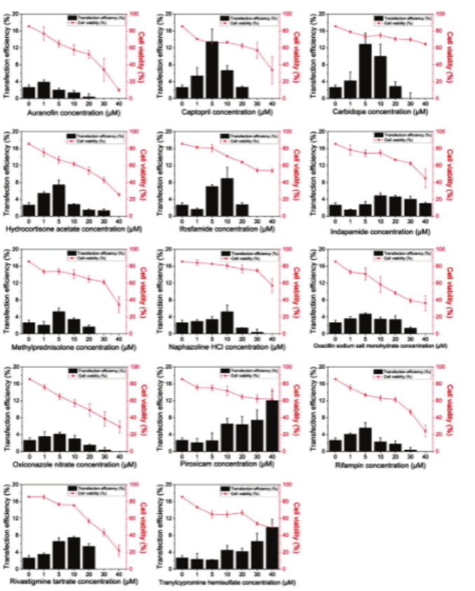 細胞活力:14種化合物均隨濃度升高導致細胞活力下降(PI染色檢測),提示轉染增強效果需平衡藥物毒性。