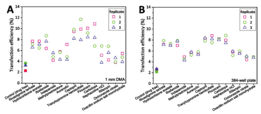 圖6. 在最佳濃度下,在A)1mm DMA和B)CHO-K1細胞的384孔板上的單個斑點中,兩種形式的所有三個分析重復中,來自初步篩選的命中化合物的影響。單獨顯示了每個拍攝的圖像/每個孔(每個斑點)中的轉染效率。不同的形狀表示單個重復(重復1-正方形,重復2-圓形和重復3-三角形)。根據二次篩選,每種藥物的最佳工作濃度用于每種藥物(表S2,支持性信息)。用在10μLScreenFect稀釋緩沖液中的0.017 μLScreenFectA制備轉染復合物,隨后將在稀釋緩沖液中的總共17ngGFP質粒DNA稀釋至10 μL的最終體積(ScreenFectA與質粒DNA的比例為1:1)。然后將濃度為7.13×104個細胞mL-1的80 μL新鮮細胞懸液加入復合物中,然后混合并以20 μL/孔的體積接種到每個孔中。數據表示為三次生物學實驗的平均值±SD,每次三次技術重復。