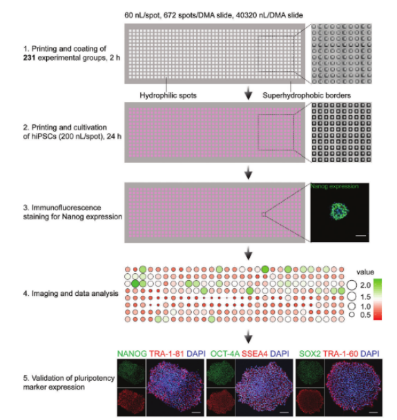 人誘導多能干細胞(hiPSCs)是疾病建模、再生醫學的核心工具,但傳統培養依賴Matrigel等動物源涂層,存在批次差異大、臨床應用受限的問題;而人源重組蛋白篩選因傳統高通量篩選(HTS)試劑消耗大、成本高難以推進[1]。dropletmicroarray(DMA)平臺憑借超微量反應(200 nL/斑點)、低消耗(蛋白用量僅為96孔板的1/860)的優勢,為解決這一難題提供了新思路。本研究通過DMA篩選231種人源蛋白組合,成功挖掘出可長期維持hiPSCs多能性的無動物源涂層,為hiPSCs臨床轉化與基礎研究奠定基礎。