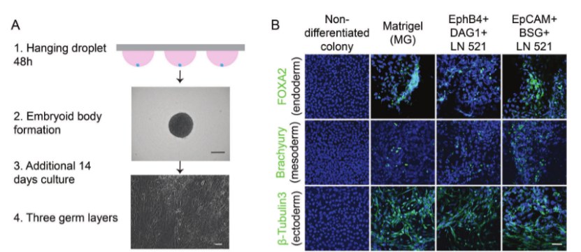 圖2. 通過分化成三個胚層來驗證來自初步篩選的兩個命中。A)HiPSCs分化為三個胚層的示意圖。(B)在未分化集落(NC)和表面涂有MG、BIK(EphB4+DAG1+LN521)和GHK(EpCAM+BSG+LN521)的HiPSCs中,檢測FOXA2(內胚層)、brachyury (中胚層)和??-微管蛋白3(外胚層)的標記。比例尺:20 μm。