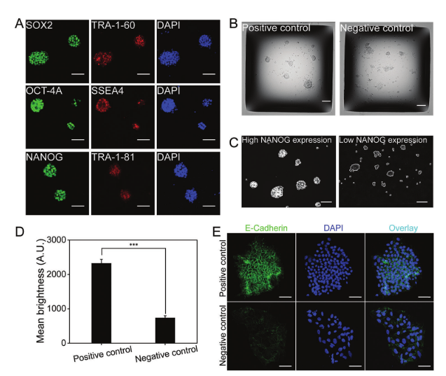 圖3.篩查方案的有效性。A)在涂有Matrigel的DMA玻片上200 nL液滴中培養的HiPSCs的典型共聚焦激光掃描顯微鏡(CLSM)圖像,并對六種多能性標志物進行染色:SOX2、OCT-4A、NANOG、TRA-1-60、SSEA4和TRA-1-81。三個獨立的實驗(n=3)獲得了可比較的結果。用DAPI對細胞核進行反染。比例尺:50μm。b)陽性對照(Matrigel,MG+)和陰性對照(非Matrigel,MG?)培養的HiPSCs的亮視野圖像。標尺:100μm. c)NANOG表達水平作為初步篩選的讀數。如果在DMA上進行染色,然后進行自動顯微鏡觀察。一張圖片中的所有菌落都來自這一滴。比例尺:50μm.d)對培養在陽性和陰性對照上的HiPSCs的平均亮度(平均熒光強度)進行定量,并對多能性標記NANOG進行染色。平均熒光強度計算為總熒光強度除以面積(以像素為單位)。*P <0.001,陽性對照和陰性對照有顯著差異。(Z?值介于0.5和1之間,對應于高質量的篩選試驗)。數據以平均值±3SD表示。(n=3)E)陽性和陰性對照涂層培養的HiPSCs中E-鈣粘蛋白表達的CLSM圖像。E-鈣粘附素介導細胞間的相互作用,并有助于干細胞克隆的形成和多能性。因此,在陽性對照涂層上,未分化的HiPSCs高表達E-cadherin,而在陰性對照涂層上,分化的HiPSCs顯示低或不表達E-cadherin。用DAPI對細胞核進行反染。比例尺:25 μm。