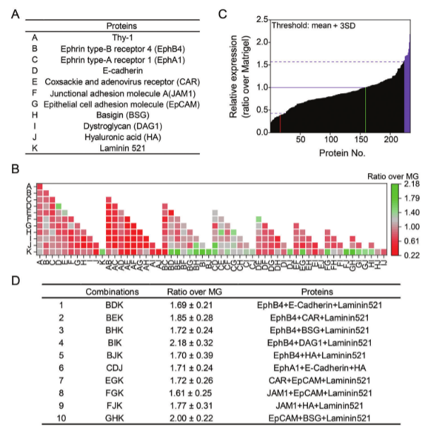 圖4. 蛋白質初篩結果。A)篩查中使用的蛋白質及其相應字母代碼的清單。B)顯示在含有單一蛋白質和蛋白質組合的涂層上培養的HiPSC中NANOG表達的倍增變化的熱圖。每個獨立陣列實驗使用6個重復。將每個獨立組的NANOG表達的平均熒光強度與在Matrigel(MG)涂層上培養的細胞的NANOG表達水平進行歸一化(陽性對照)。綠色表示NANOG的高表達水平(自我更新能力較強),紅色表示與陽性對照(MG+)涂層上培養的細胞的標記表達水平相比,NANOG表達較低(自我更新能力較低)。C)在篩選中顯示所有測試蛋白質組的相對NANOG表達的曲線圖。蛋白質包被促進NANOG表達顯著改變的閾值設為Mean+3SD。紅柱表示陰性對照(無涂層,MG?),綠柱表示陽性對照(MG涂層,MG+),紫柱顯示陽性hits。D)在初步篩查中確定的前十個陽性hits的列表。