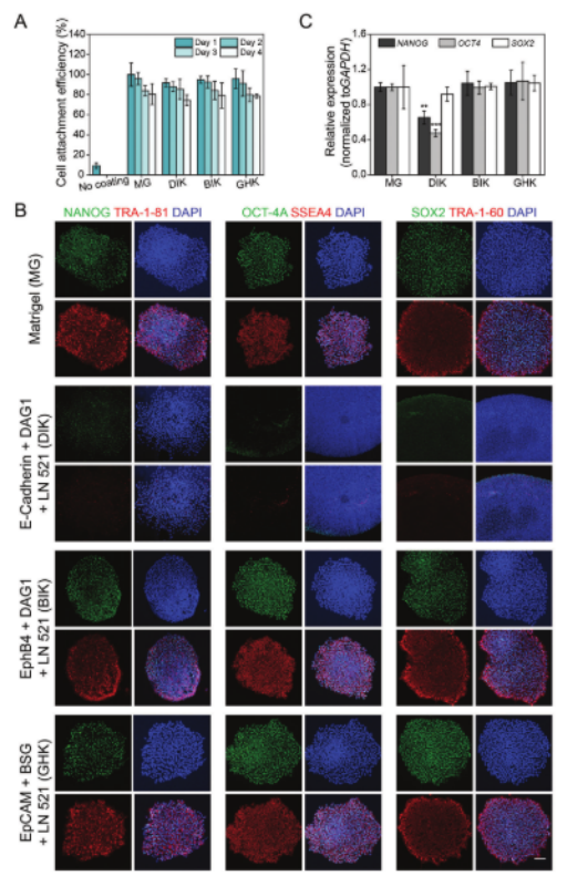 圖5.蛋白質涂層對hiPSCs長期培養的影響:驗證兩種最有效的三元蛋白質組合(BIK和GHK)的效率。A)hPSCs在非涂層12孔板、Matrigel(MG)涂層12孔板以及DIK、BIK和GHK涂層12孔板上4天的集落附著效率。初步篩選發現BIK(EphB4+DAG1+LN 521)和GHK(EpCAM+BSG+LN 521)表達較強的NANOG,而以DIK(E-鈣黏蛋白+DAG1+LN 521)蛋白培養的細胞NANOG表達較低。數據以平均值±3SD表示。(n=3)在MG、DIK、BIK和GHK涂層上培養的HiPSCs的圖像,并對6種多功能標志物進行染色:Nanog、OCT-4A、SOX2(綠色熒光);TRA-1-81、SSEA4、TRA-1-60(紅色熒光)。比例尺:50μm。c)生長在MG、DIK、BIk和GHK包被的井板上的hiPSCs 5代(n=3,生物復制)的多能性標記基因(NANOG、OCT4和SOX2)的定量聚合酶鏈式反應分析。對照參考基因GAPDH對基因表達數據進行歸一化。在培養在DiK、BIK和GHK涂層上的HiPSCs中,基因表達水平與生長在MG上的細胞的基因表達水平正常化。數據以均值 ±SEM(標準誤)表示。**P <0.01和*P<0.001,MG組與Dik組之間有顯著差異。
