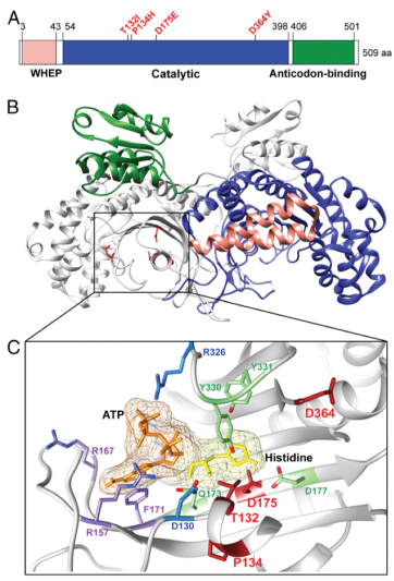組氨酰-tRNA合成酶,是與CMT疾病相關(guān)的6種aaRSs中的一種,被歸類為 CMT2W 亞型,其主要表現(xiàn)為軸索型癥狀,并且為常染色體顯性遺傳。根據(jù)新的CMT疾病分類標(biāo)準(zhǔn),該亞型也被稱為AD-CMTaxHARS。人類的HisRS蛋白由三個不同的結(jié)構(gòu)域組成:N-端的WHEP結(jié)構(gòu)域,催化結(jié)構(gòu)域和C端反密碼子結(jié)合域(請見Fig. 1A)。有趣的是,與CMT疾病相關(guān)的HisRS突變位于催化位點附近的催化結(jié)構(gòu)域(請見Fig. 1)。