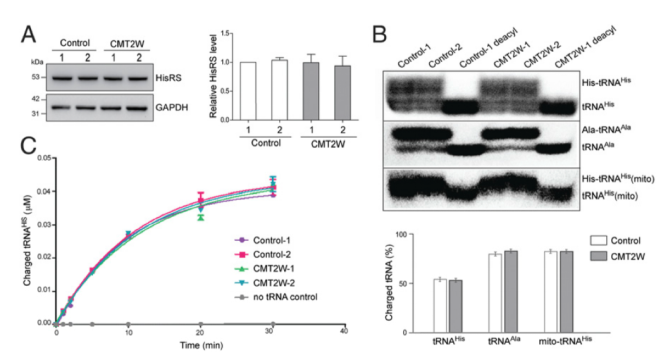 酵母互補實驗中,HisRS P134H完全無法支持細胞的生長,表明突變蛋白缺乏將tRNA與組氨酸結(jié)合的酶活性。為了在P134H的病人樣本中更進一步理解是否野生型HARS等位基因能夠提供足夠的酶活性以代償?shù)任换蛲蛔冊斐傻墓δ軉适В覀兎治隽薈MT2W病人家族中的HisRS酶活性。首先比較了來自于2例P134H病人和2例沒有攜帶突變的正常家族的永生的淋巴細胞中的HisRS蛋白水平,未發(fā)現(xiàn)差異(請見Fig. 2A),表明突變未影響HisRS的表達和穩(wěn)定性。為了評估HisRS的酶活性,我們通過Northern blot檢測在這些樣本中,內(nèi)源性tRNAs的原位氨酰化狀態(tài)。提取樣本總RNAs并于酸性條件下進行凝膠電泳,以維持tRNAs的酰化狀態(tài)。細胞中,同源胞質(zhì)型 tRNA 的帶電部分(結(jié)合組氨酸)占比約為 50%,該水平在病人和健康的家族樣本中是一致的(Fig. 2B)。做為對照,我們鑒定了非同源的細胞質(zhì)tRNA(tRNAAIa)和線粒體tRNA的His水平,同樣未發(fā)現(xiàn)差異(請見Fig. 2B)。接下來,為了確認病人樣本中酶活性喪失的情況,我們使用細胞裂解液進行了體外氨酰化檢測,比較了蛋白將tRNA氨酰化的能力。我們發(fā)現(xiàn)在2例CMT樣本和對照樣本中,氨酰化酶活性并未降低(請見Fig. 2C)。明顯的是,與野生型HisRS相比,P134H突變的HisRS未產(chǎn)生(顯性)負效應(yīng),以減弱細胞中tRNA的氨酰化的能力。因此,我們推斷在大多數(shù)嚴重的病人細胞中,tRNA攜帶His的水平未受到影響。
