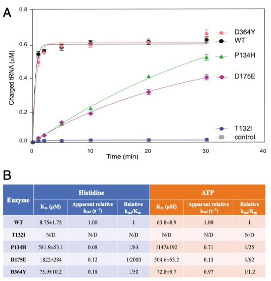 目前未有證據(jù)支持在大多數(shù)嚴重的CMT2W病人中,氨酰化水平的明顯缺失是源于功能喪失的機制。這使得我們進一步通過體外氨酰化檢測,比較HisRS P134H的氨酰化和表現(xiàn)為輕微表型的CMT2W相關(guān)的突變樣本的氨酰化。過表達并純化人的重組野生型HisRS蛋白和4例CMT2W突變型蛋白,以用于精確的檢測分析。有趣的是,與酵母中完全的功能喪失表型相比,HisRS P134H具有很強的活性,氨酰化是野生型的40%,而HisRS D364Y具有完全的氨酰化酶活性。與酵母中檢測結(jié)果一致,HisRS T132I功能完全喪失,HisRS D175E具有部分酶活性,略低于HisRS P134H的活性。已得知T132I突變導(dǎo)致了最嚴重的氨酰化功能喪失,但是誘導(dǎo)了相對輕微的表型,沒有證據(jù)證明酶活性和疾病的嚴重程度之間存在相關(guān)性。最近相繼報道了和CMT2W相關(guān)聯(lián)的其他突變(例如V155G,Y330C,S356N)并檢測了它們對酶活性動力學(xué)的影響。3個已報道的突變在結(jié)合底物的能力上均有缺失,尤其是和ATP以及組氨酸結(jié)合的能力。為了檢測這種結(jié)合的缺失是否在上述四種突變中存在,我們通過ATP/PPi交換檢測實驗對結(jié)合動力學(xué)進行分析,檢測2步氨酰化反應(yīng)中的第一步。在該檢測中,HisRS T132I完全喪失了功能,無法進行動力學(xué)分析。其他突變(HisRSP134H , HisRSD175E和HisRSD364Y)在不同程度上,與組氨酸和ATP結(jié)合的米氏常數(shù)(Km)均有增加(請見Fig. 3B),表明突變體在底物結(jié)合能力上的缺失,與其他3個CMT2W突變體的結(jié)果相一致。然而,由于tRNA氨酰化的第一步并不是限速步驟,與組氨酸和ATP結(jié)合能力的輕微缺失并不影響總體的氨酰化反應(yīng)。與tRNA氨酰化檢測類似(請見Fig. 3A), HisRS D364Y在ATP/PPi交換檢測實驗中表現(xiàn)出最小程度的活性缺失(請見Fig. 3B)。從實驗數(shù)據(jù)中得到的酶活性強弱順序為T132I > D175E > P134H > D364Y,與疾病嚴重程度并無相關(guān)性。
