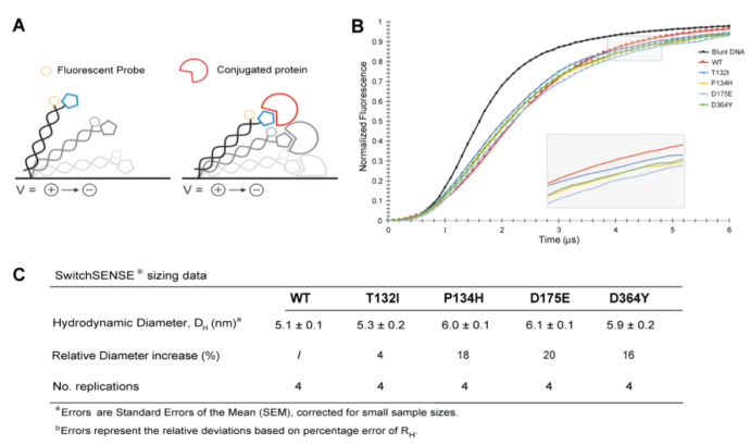 為了證實觀測到的所有4種CMT突變能夠誘導(dǎo)蛋白形成疏松結(jié)構(gòu),我們利用switchSENCE技術(shù)評估這些蛋白的流體動力學(xué)半徑。短的雙鏈DNA一端被偶聯(lián)在芯片的金屬表面,另一端與待測蛋白進行結(jié)合(請見Fig. 4)。交替變換的正負電壓作用于該DNA雙鏈,并通過與DNA雙鏈連接的熒光探針實時記錄蛋白的運動軌跡。一旦HisRS蛋白偶聯(lián)到DNA雙鏈,DNA雙鏈的流體動力學(xué)摩擦系數(shù)受到影響,DNA的運動速率也同樣受到影響。儀器記錄DNA雙鏈的運動情況,通過該運動的變化情況估測蛋白的流體動力學(xué)半徑。我們發(fā)現(xiàn)所有的突變體,與野生型相比,流體動力學(xué)半徑都有不同程度的增加,相對增加程度在4%和20%之間。HisRS T132I的增加是最小的,與野生型相比,僅有4%的增加。HisRSP134H , HisRSD175E 和HisRSD364Y的變化較為相似,分別為18%,20%和16%。
