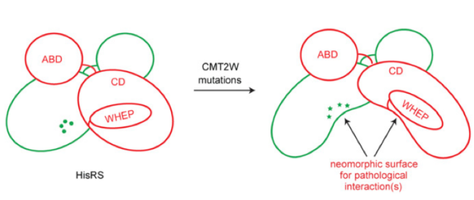 通過測量HisRS突變體的活性,我們可以推斷活性和疾病病情間的相互關(guān)聯(lián),同樣,我們也可以推論蛋白構(gòu)象變化和疾病病情間的相互關(guān)聯(lián)情況。蛋白由于構(gòu)象的改變暴露的新的界面可能介導(dǎo)了多種相互作用和毒性功能獲得性效應(yīng),導(dǎo)致疾病的發(fā)生和發(fā)展(請見Fig. 5)。總的來說,本研究提供了一種在CMT患者細胞中研究tRNA合成酶的方法。本研究將疾病的表型和蛋白結(jié)構(gòu)的改變進行了關(guān)聯(lián)分析,為將來的分子機制研究打開了一種新的思路。