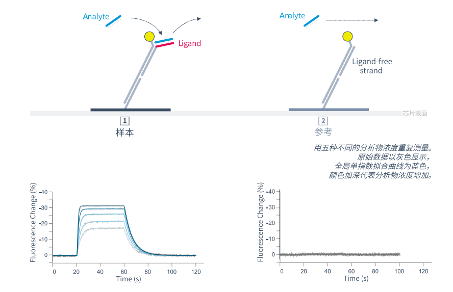 以無與倫比的細節解析分子間相互作用。在分析物分子的存在時,染料的熒光被淬滅。熒光的變化直接反映分子的結合和解離。
