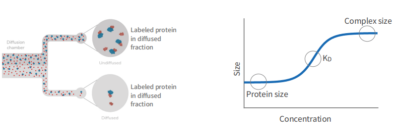 MDS(Microfluidic Diffusional Sizing)利用液體層流的特性來(lái)測(cè)量微流控芯片中穩(wěn)態(tài)流下分子的擴(kuò)散速率。通過(guò)標(biāo)記在分子上的熒光可以確定每條液流中分子的數(shù)量。兩條液流中的熒光比值給出分子的流體動(dòng)力學(xué)半徑(Rh)。