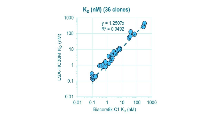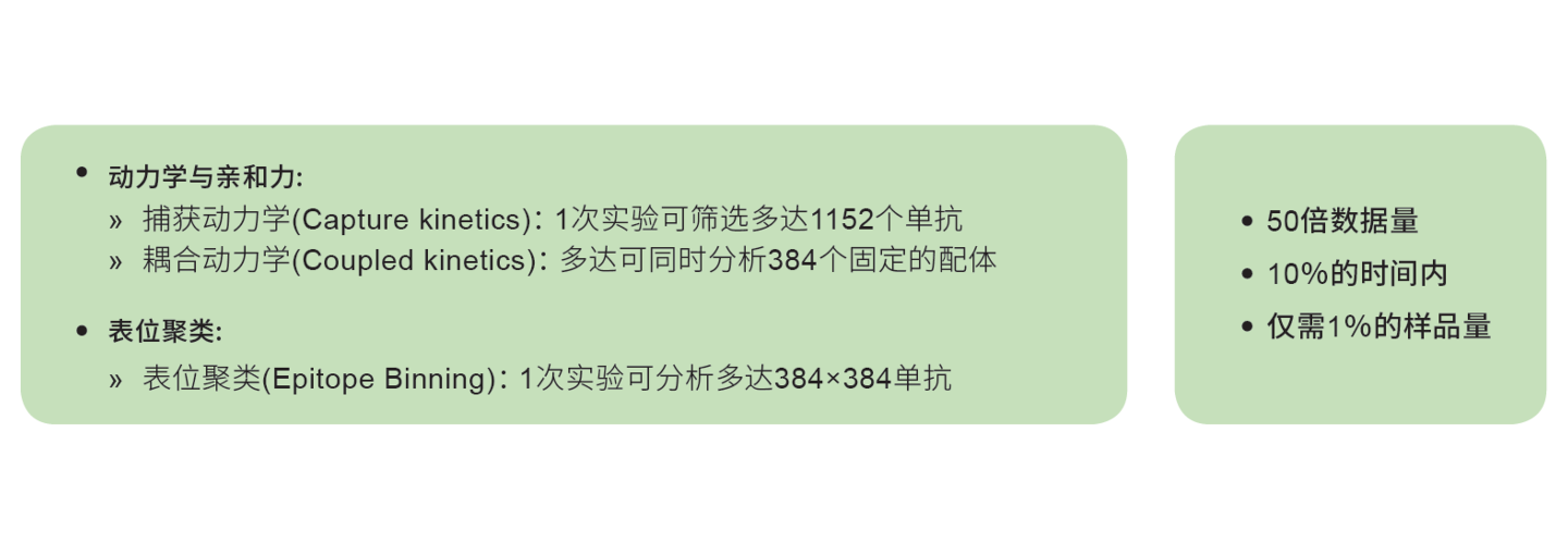 LSA是全方位集成的高通量單克隆抗體篩選和表征的平臺,此平臺將連續流微流控技術與陣列式表面等離子體共振(SPR)檢測結合再一起,從而實現高通量動力學(kinetics)和表位發現(epitope discovery) 的應用,以完成先進水平的抗體開發項目。