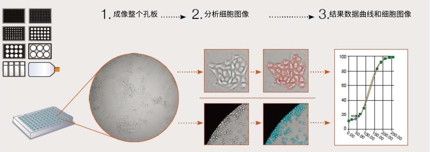軟件以工作流程為基礎,具有直觀的界面,可同時成像和分析;提供動態分析,例如多時間點拍攝生長追蹤,細胞群進行類流式設門分析和細胞群統計報告。可用彩色疊加圖顯示特定細胞群的細胞圖像。
