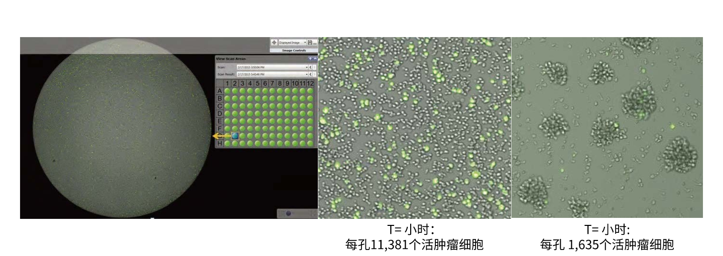 腫瘤細胞殺傷動態檢測:在使用Calcein AM進行無損、動態實驗的過程中,我們在第0小時和第6小時獲取同-96孔板(顯示于下側)的圖像。Celigo圖像證實:在同一孔中,Calcein AM陽性活腫瘤細胞的數量從11,381減少到1,635。